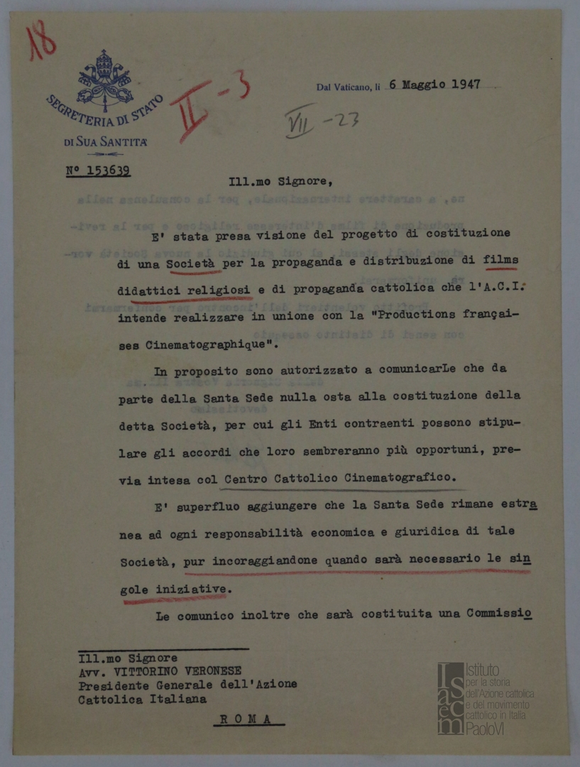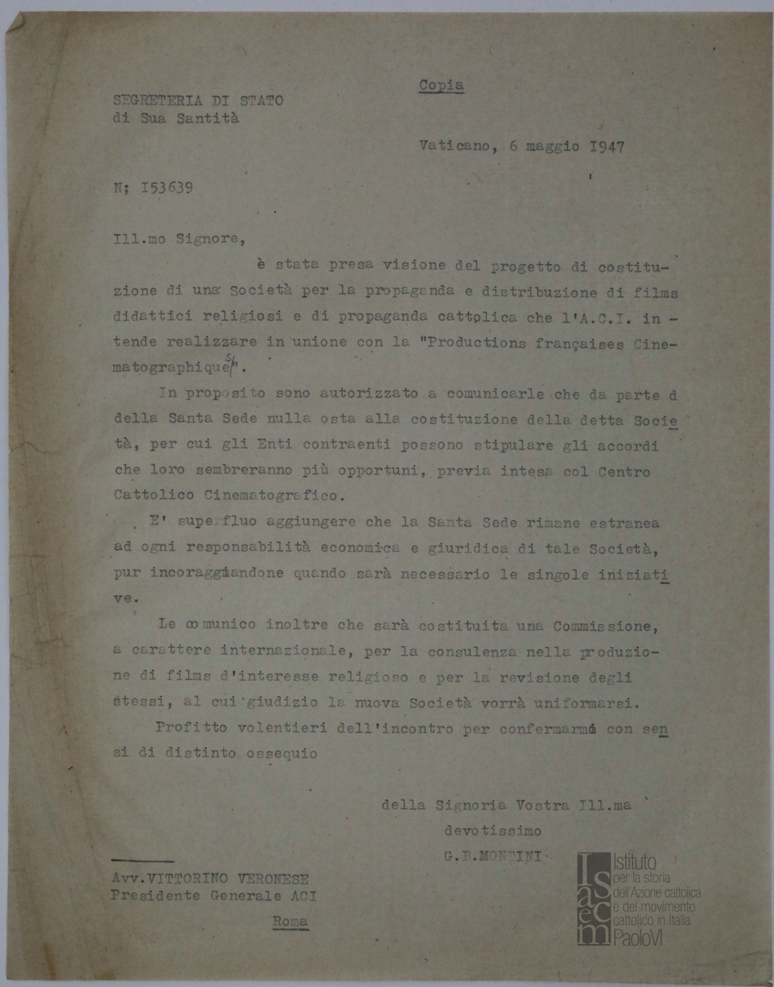 Lettera di mons. Giovanni Battista Montini, sostituto alla segreteria di Stato di Sua Santità, a Vittorino Veronese, presidente dell'ACI