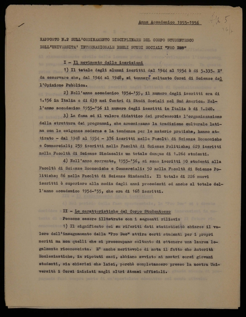 "Anno accademico 1955-1956. Rapporto n. 2 sull'ordinamento disciplinare del corpo studentesco dell'Università internazionale degli studi sociali Pro Deo"