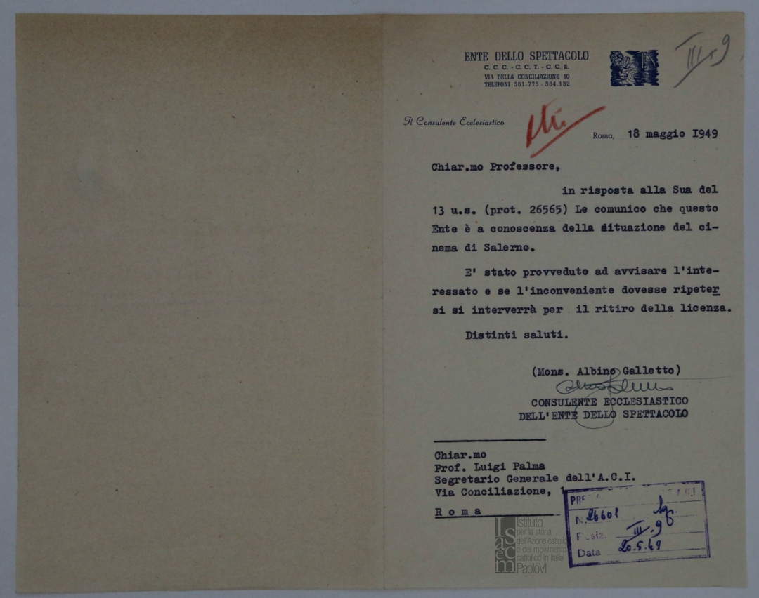 Lettera di mons. Albino Galletto, consulente ecclesiastico dell'Ente dello spettacolo, a Luigi Palma, segretario generale dell'ACI