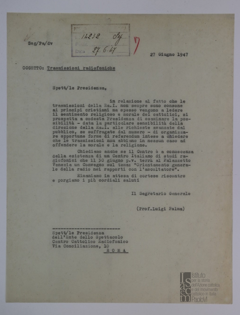 Lettera di Luigi Palma, segretario generale del Centro nazionale di Azione cattolica di Roma, alla Presidenza dell'Ente dello spettacolo, Centro cattolico radiofonico - CCR