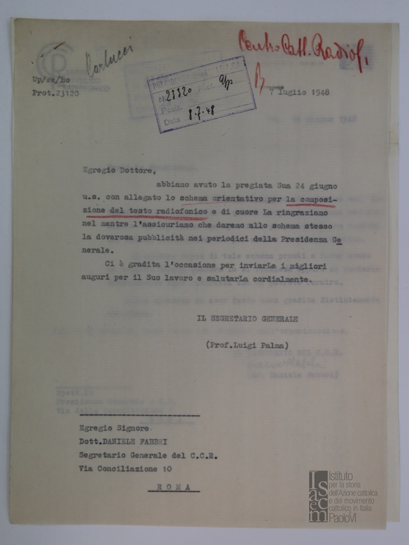 Lettera di Luigi Palma, segretario generale del Centro nazionale di Azione cattolica di Roma, a Daniele Fabbri, segretario generale del Centro cattolico radiofonico - CCR