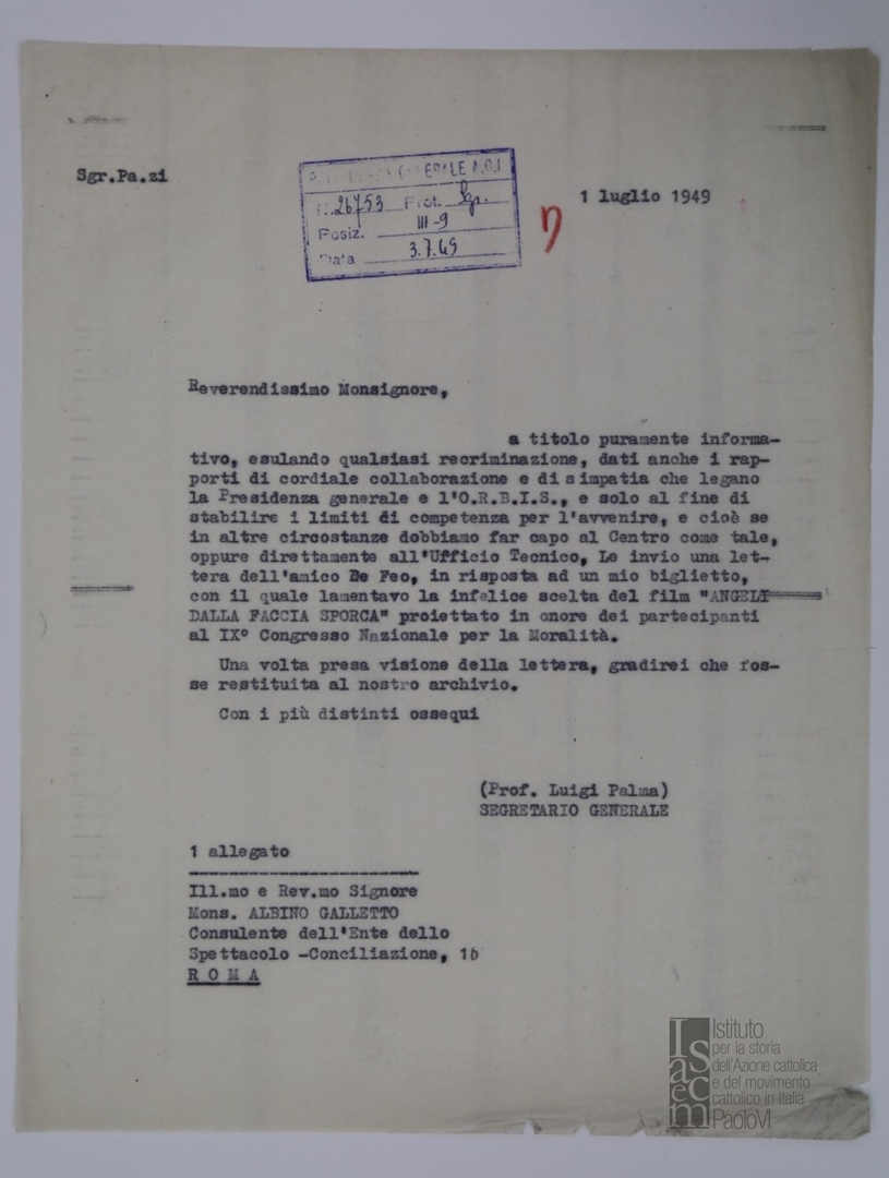 Lettera di Luigi Palma, segretario generale del Centro nazionale di Azione Cattolica di Roma, a mons. Albino Galletto, consulente ecclesiastico dell'Ente dello spettacolo