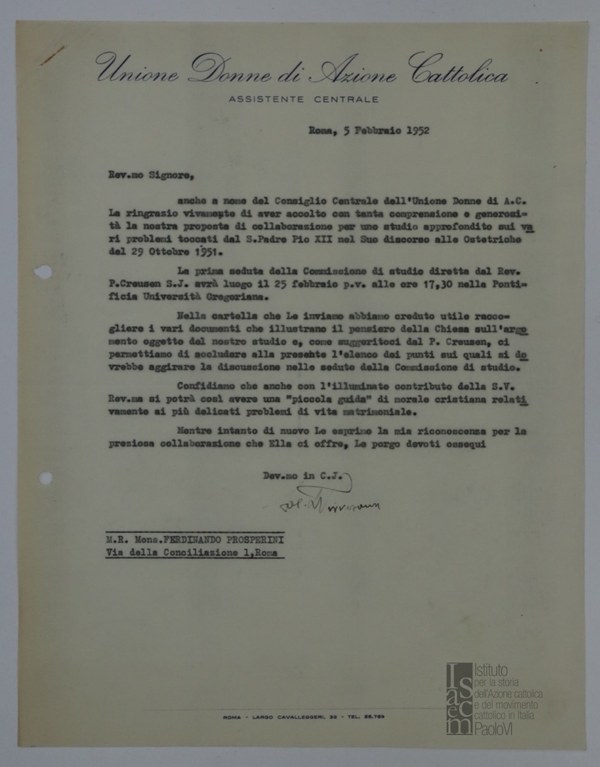 Lettera di [...], assistente centrale dell'Unione donne di Azione Cattolica, a mons. Ferdinando Prosperini