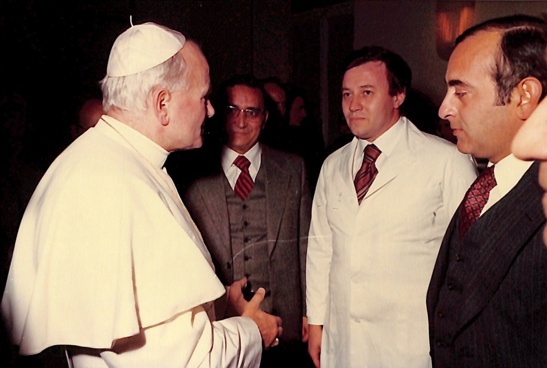 Giovanni Paolo II a colloquio con il prof. Elio Ascani, primario di Ortopedia a Palidoro. Accanto a lui il segretario generale Enzo Colaiacomo