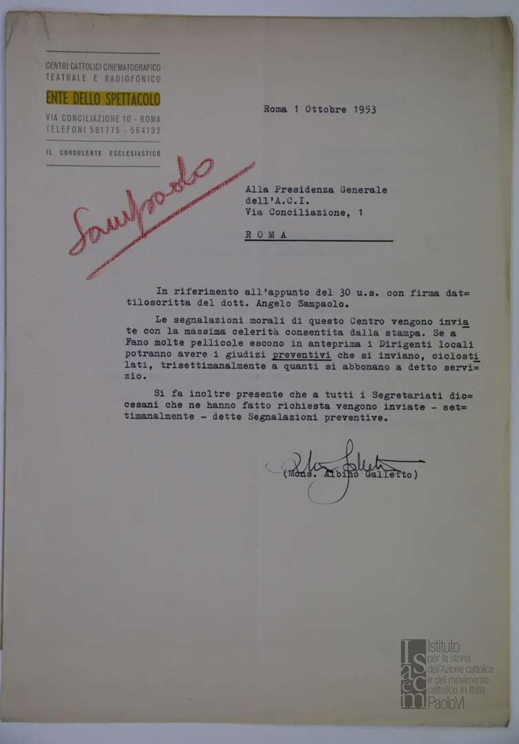 Lettera di mons. Albino Galletto, consulente ecclesiastico dell'Ente dello spettacolo, alla Presidenza generale dell'ACI