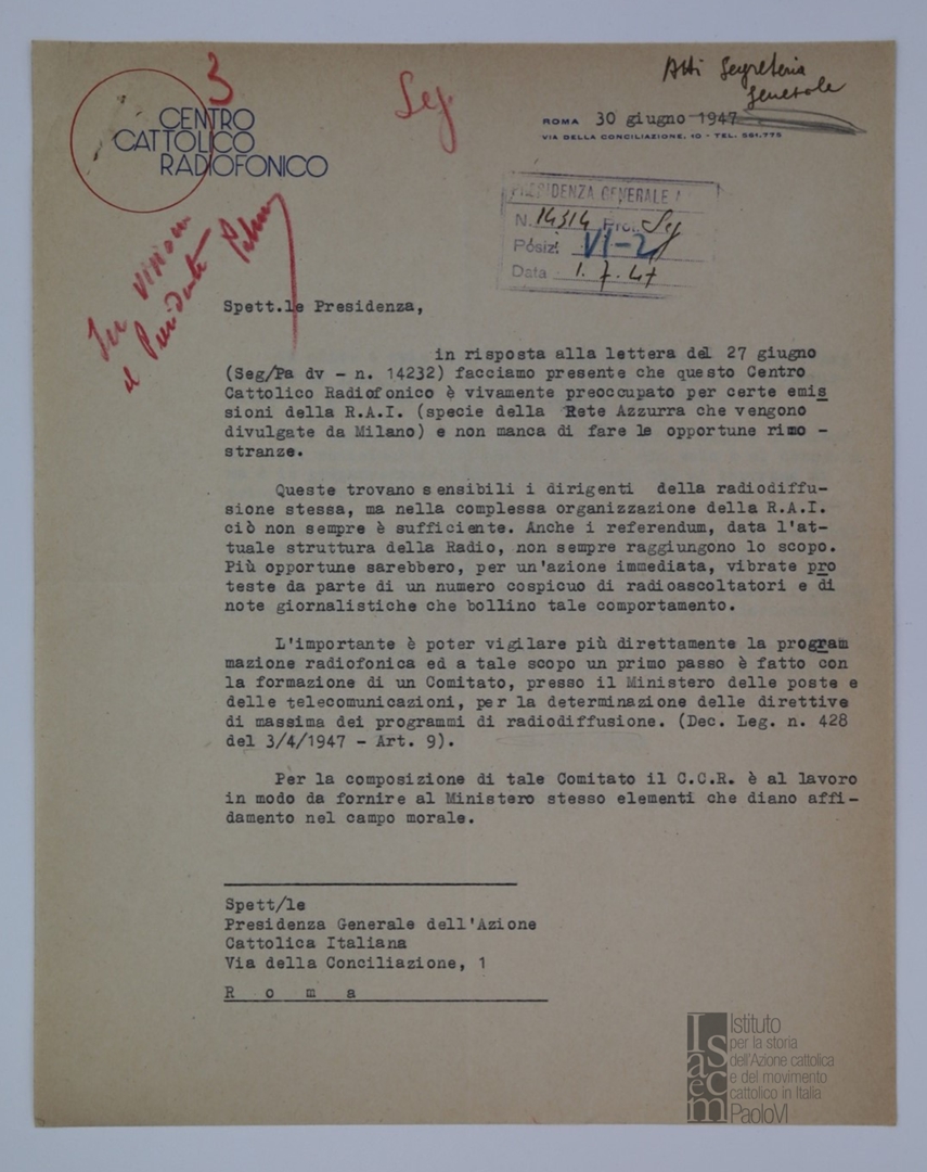 Lettera di Daniele Fabbri, segretario del Centro cattolico radiofonico - CCR, alla Presidenza generale dell'ACI