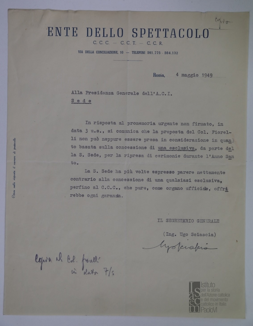 Lettera di Ugo Sciascia, segretario generale dell'Ente dello spettacolo, alla Presidenza generale dell'ACI