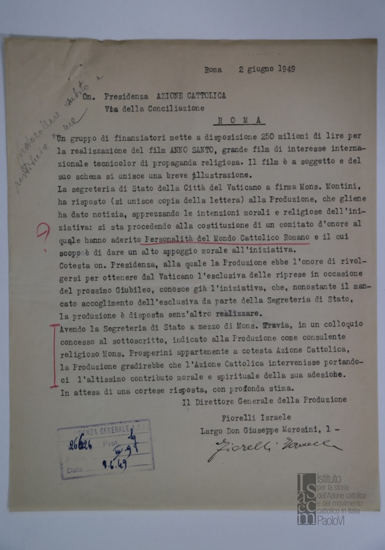 Lettera di Luigi Gedda, presidente dell'Ente dello spettacolo, alla Presidenza generale dell'ACI