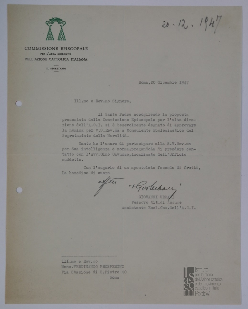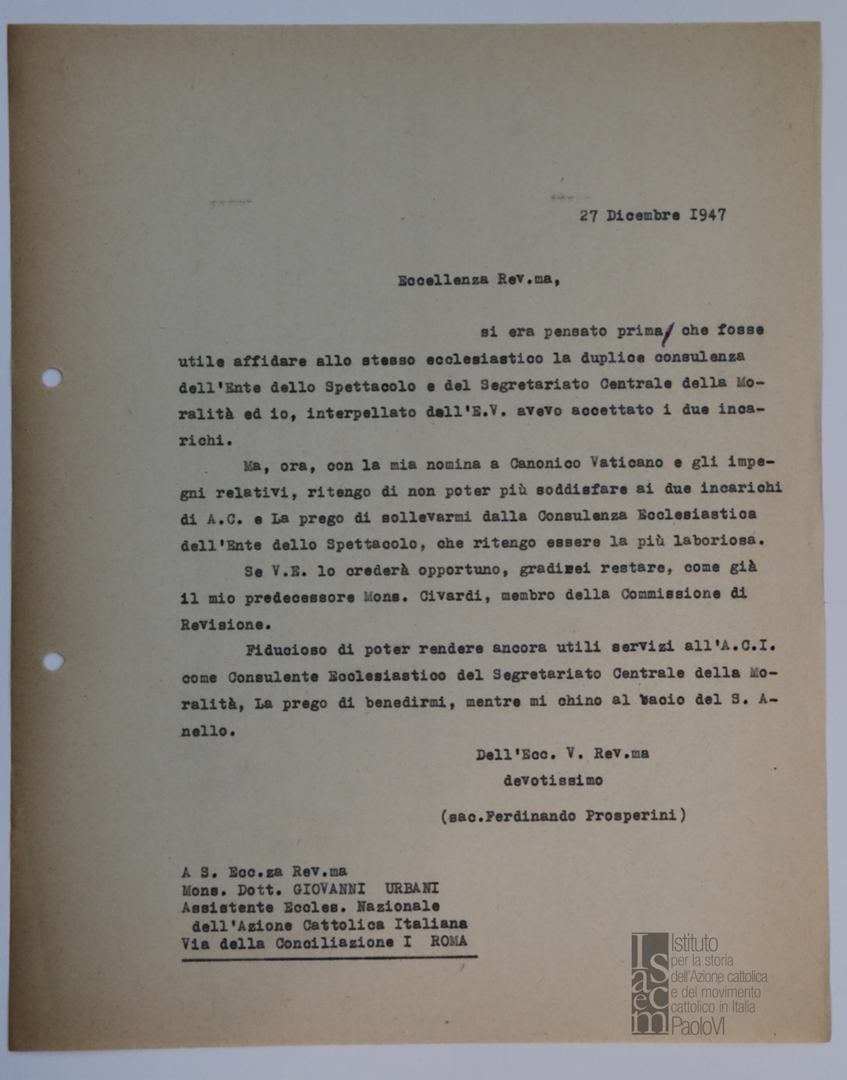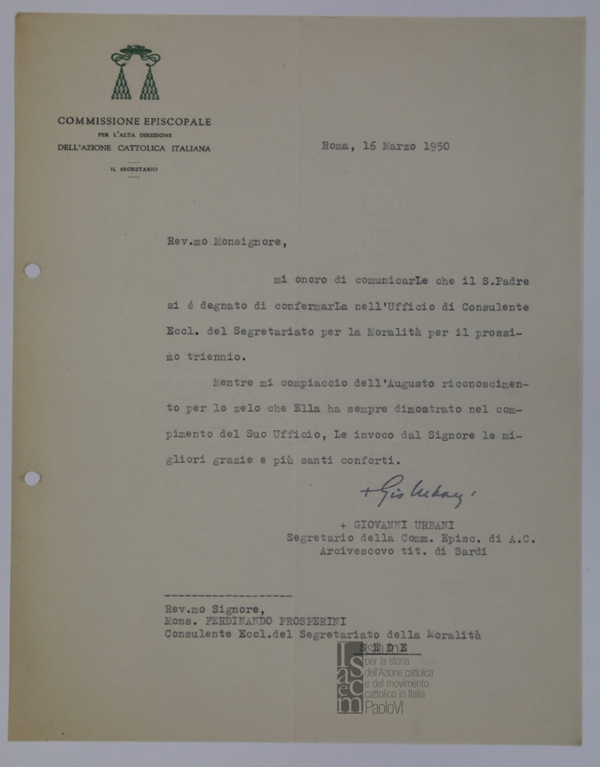 Lettera di mons. Giovanni Urbani, arcivescovo di Sardi e segretario della Commissione episcopale dell' ACI, a mons. Ferdinando Prosperini in qualità di consulente ecclesiastico del Segretariato della moralità