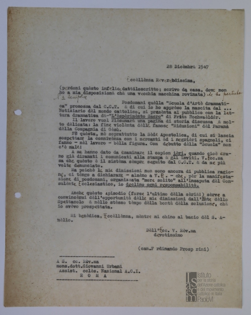 Lettera di mons. Giovanni Urbani, vescovo di Assume e assistente generale dell'Azione cattolica italiana - ACI, a mons. Ferdinando Prosperini