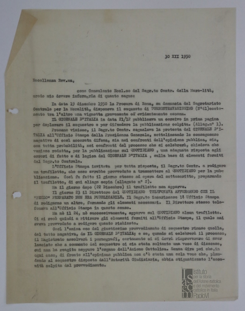 Lettera del consulente ecclesiastico del Segretariato per la moralità, non firmata, a mons. Giovanni Urbani, vescovo di Assume e assistente generale dell'ACI