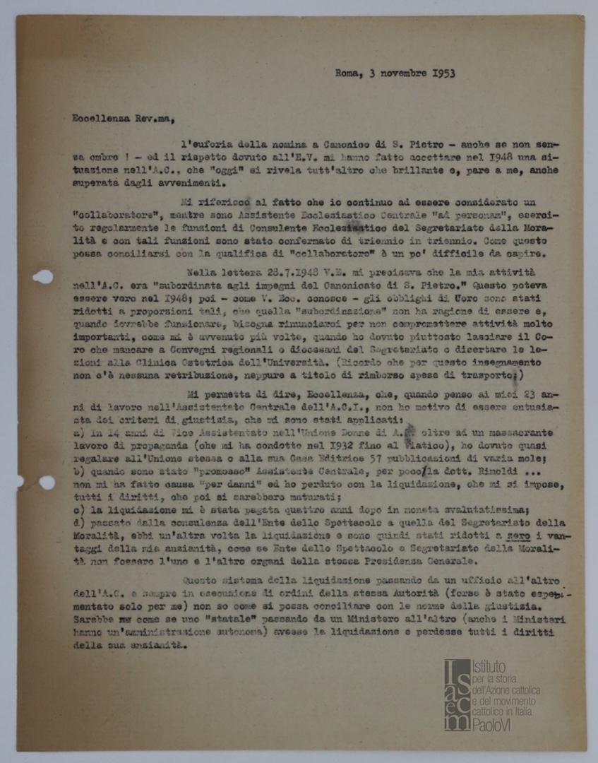 Lettera a firma di Carlo Carbone e Igino Giordani indirizzata a mons. Giovanni Urbani, segretario della Commissione Episcopale per l'ACI