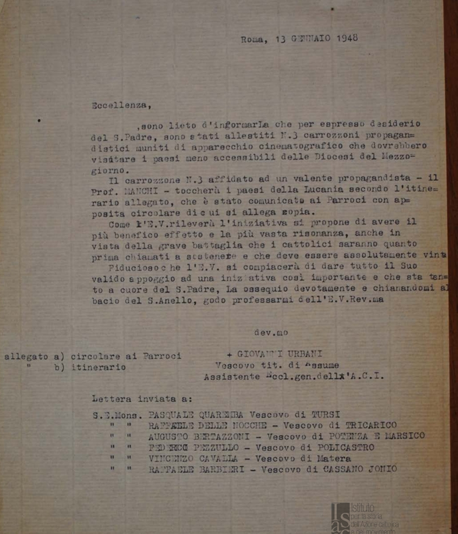 Lettera di mons. Giovanni Urbani, vescovo di Assume e assistente generale dell'ACI, ai vescovi della Lucania