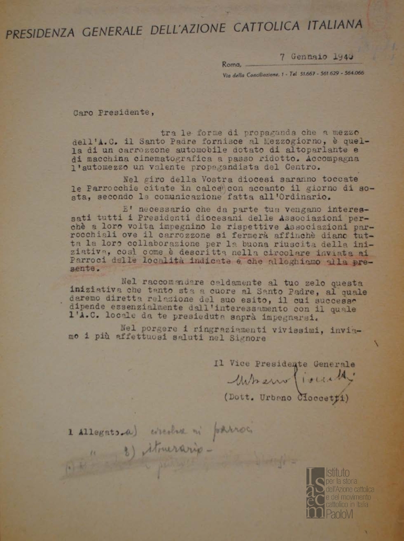 Lettera di Urbano Cioccetti, vicepresidente generale dell'Azione Cattolica, ai presidenti diocesani dell'Associazione