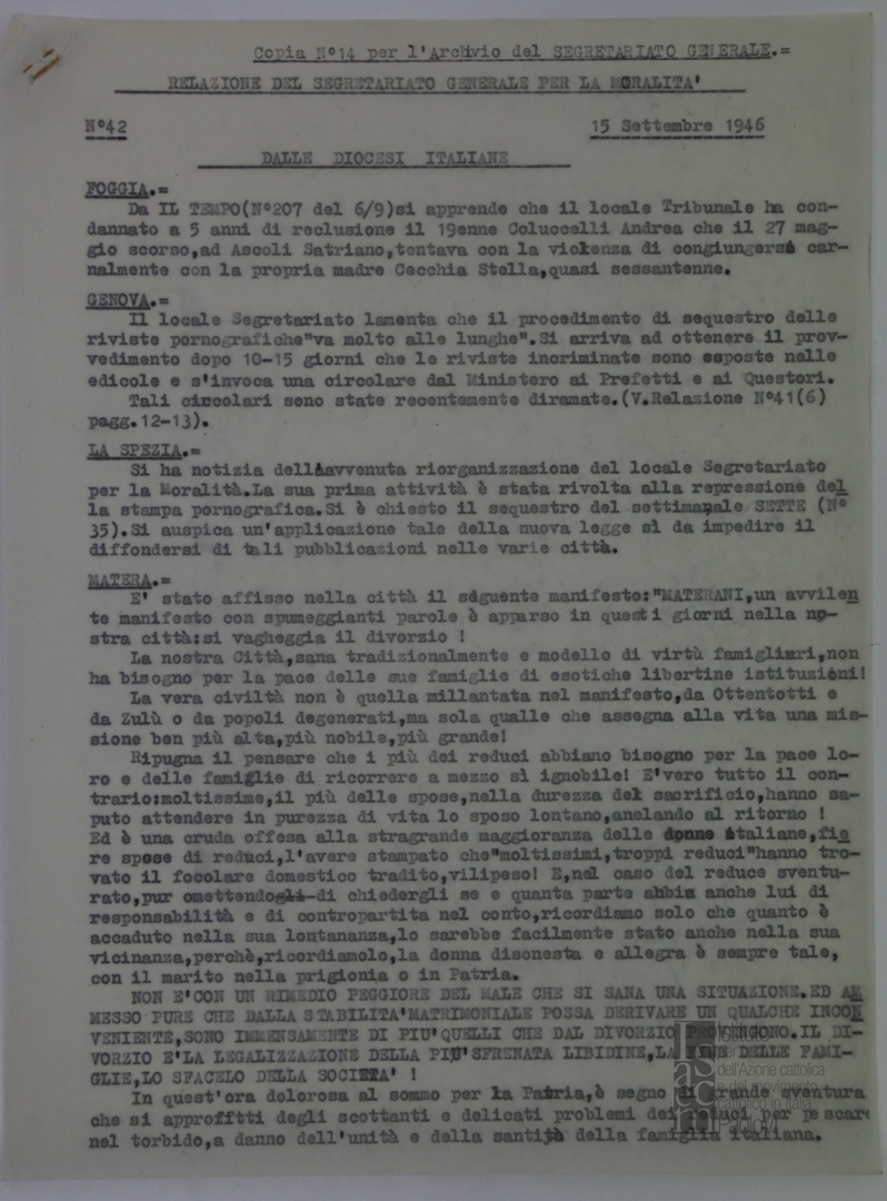 "Relazione del Segretariato Generale per la Moralità. Nr. 42"