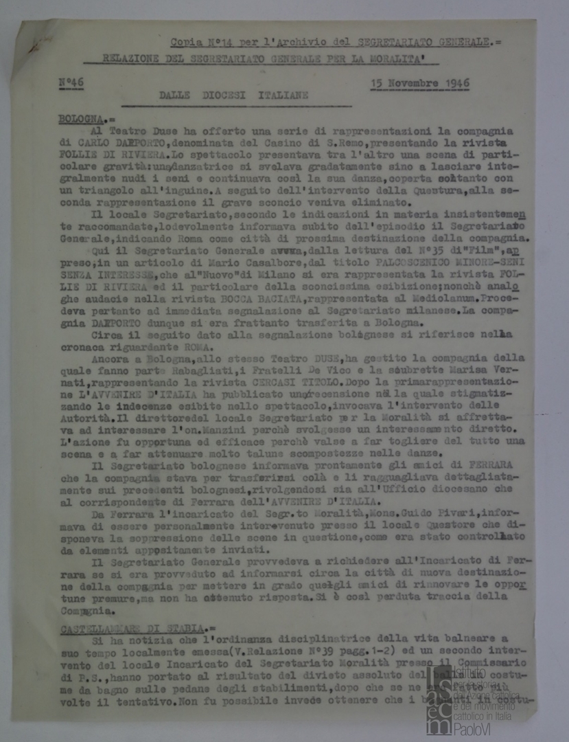 "Relazione del Segretariato Generale per la Moralità. Nr. 46"