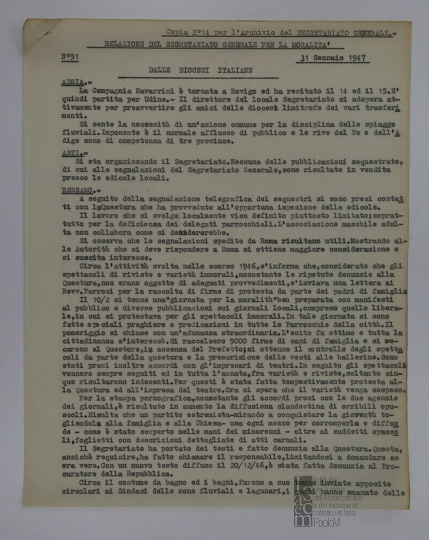 "Relazione del Segretariato Generale per la Moralità. Nr. 51"