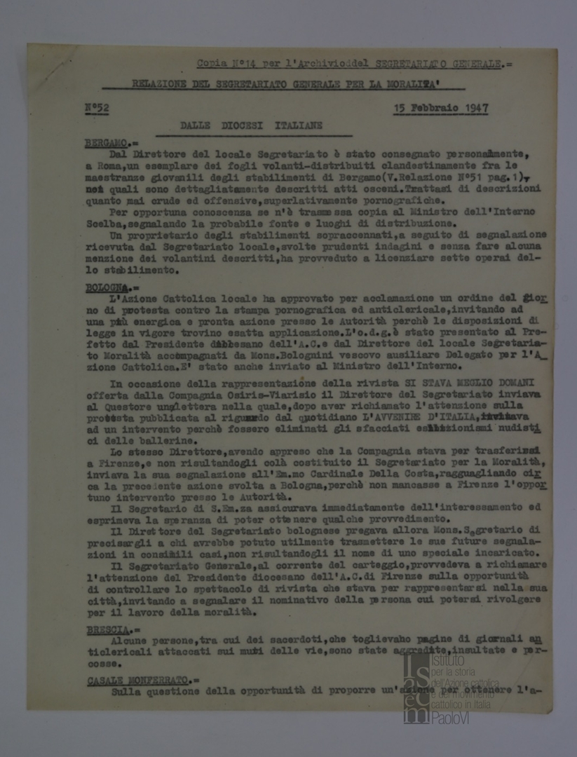 "Relazione del Segretariato Generale per la Moralità. Nr. 52"
