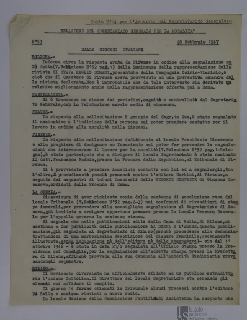 "Relazione del Segretariato Generale per la Moralità. Nr. 53"
