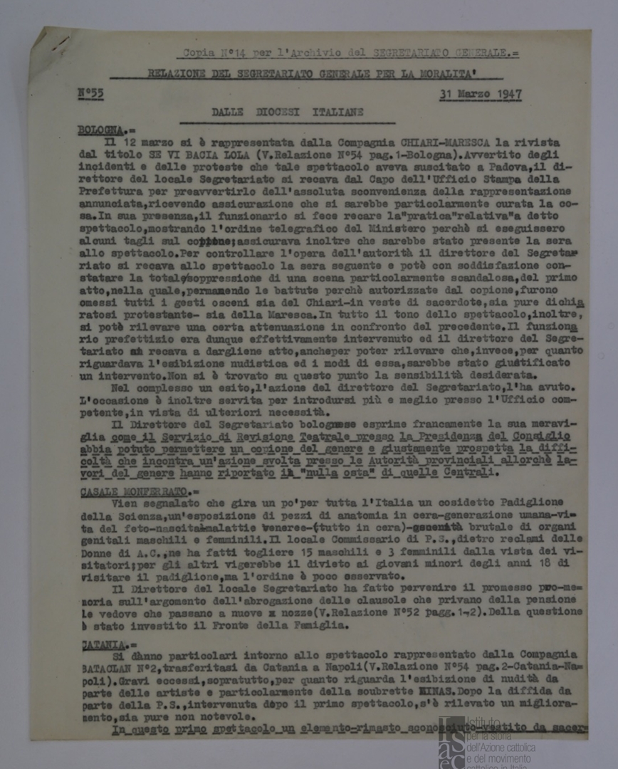 "Relazione del Segretariato Generale per la Moralità. Nr. 55"