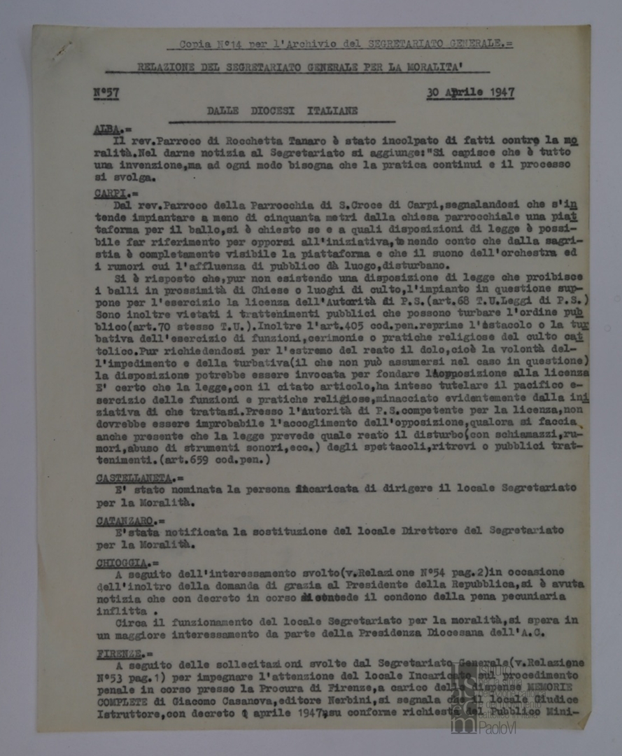 "Relazione del Segretariato Generale per la Moralità. Nr. 57"