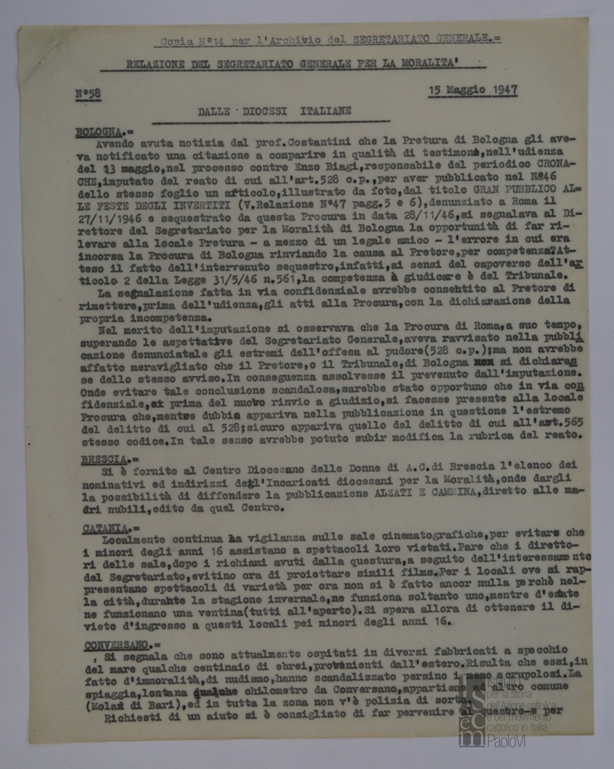 "Relazione del Segretariato Generale per la Moralità. Nr. 58"