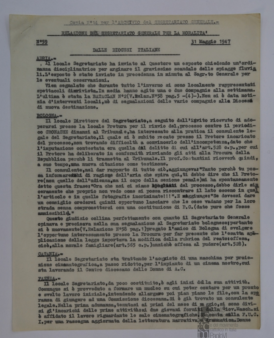 "Relazione del Segretariato Generale per la Moralità. Nr. 59"