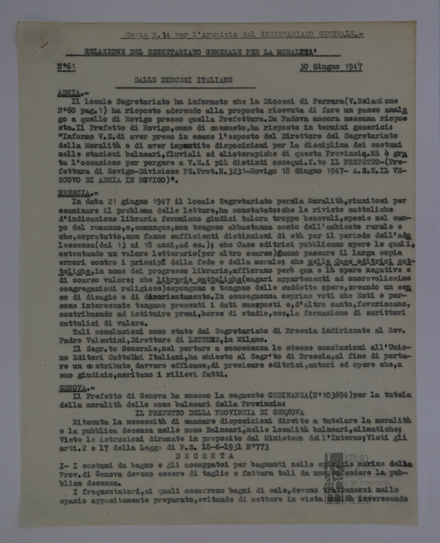 "Relazione del Segretariato Generale per la Moralità. Nr. 61"