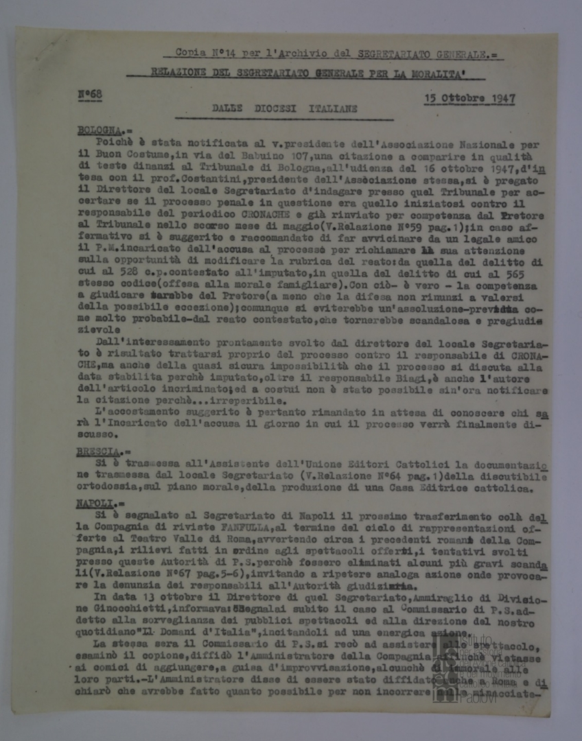 "Relazione del Segretariato Generale per la Moralità. Nr. 68"
