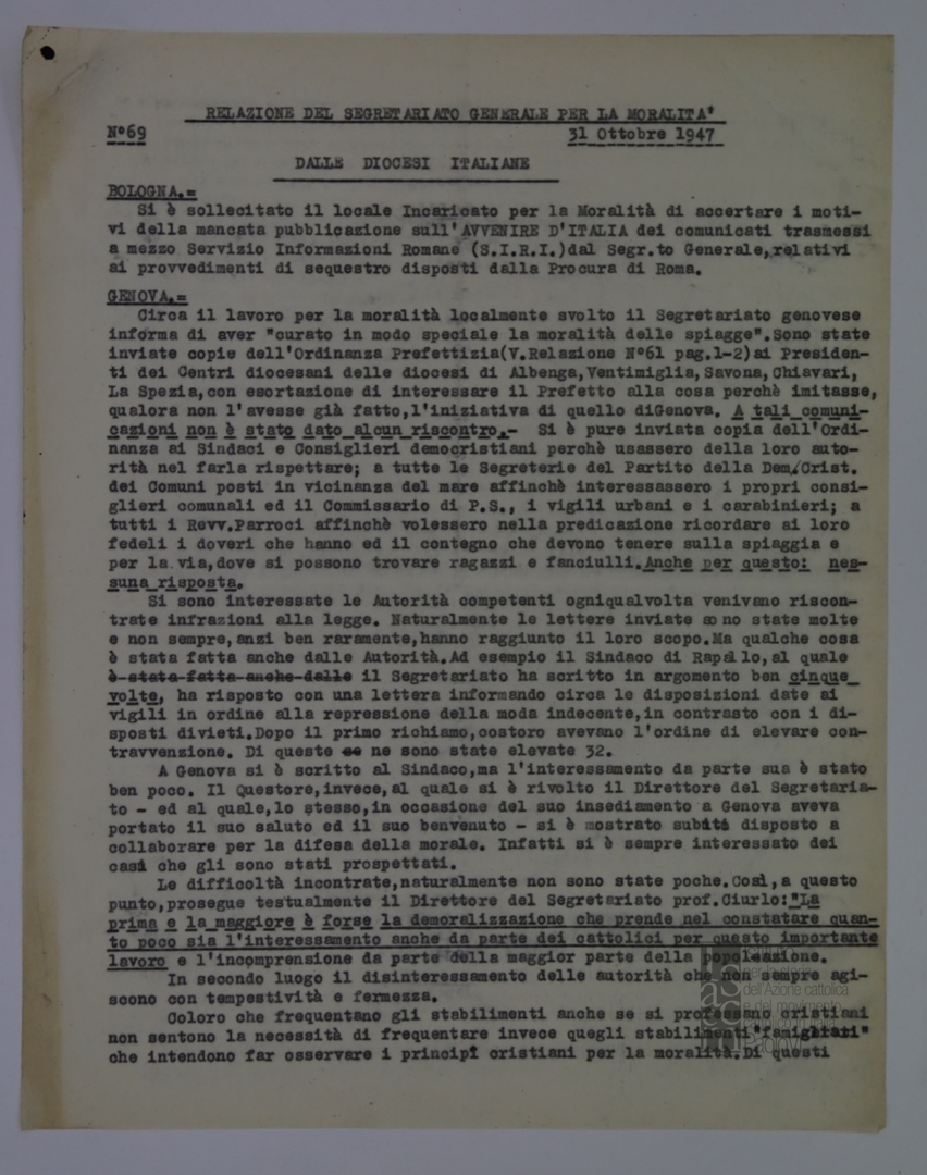 "Relazione del Segretariato Generale per la Moralità. Nr. 69"