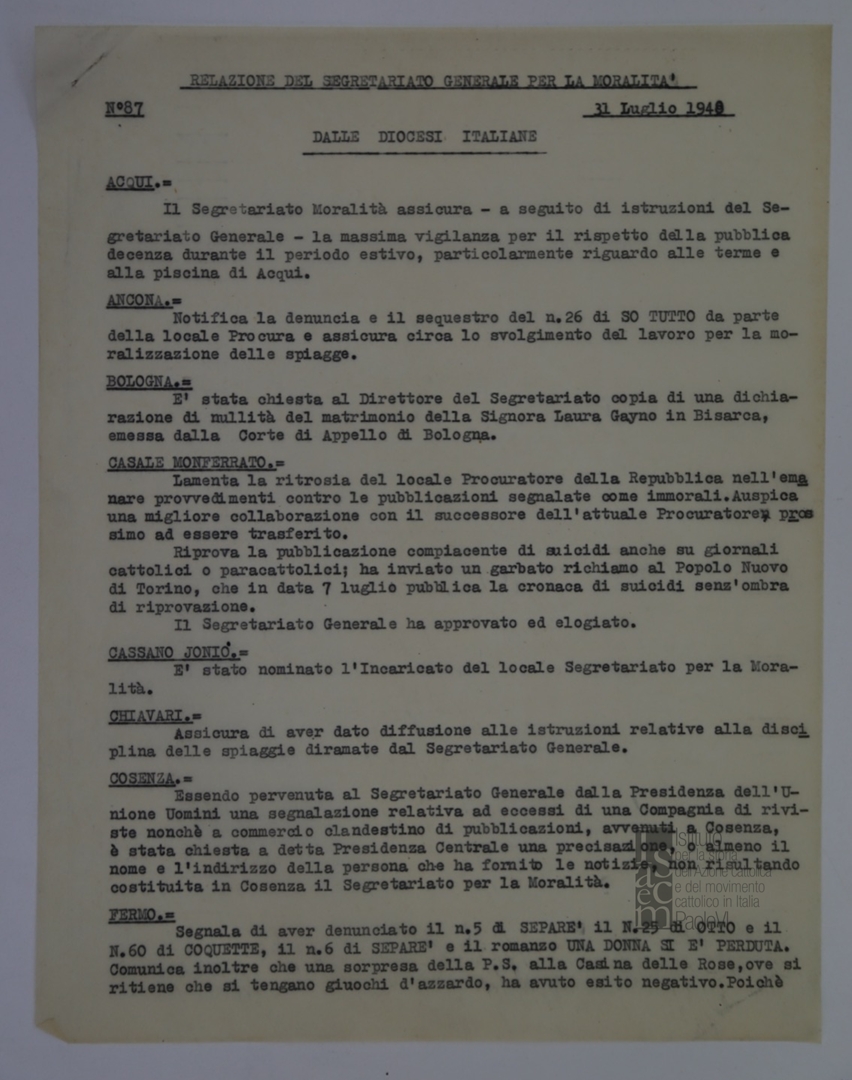 "Relazione del Segretariato Generale per la Moralità. Nr. 87"