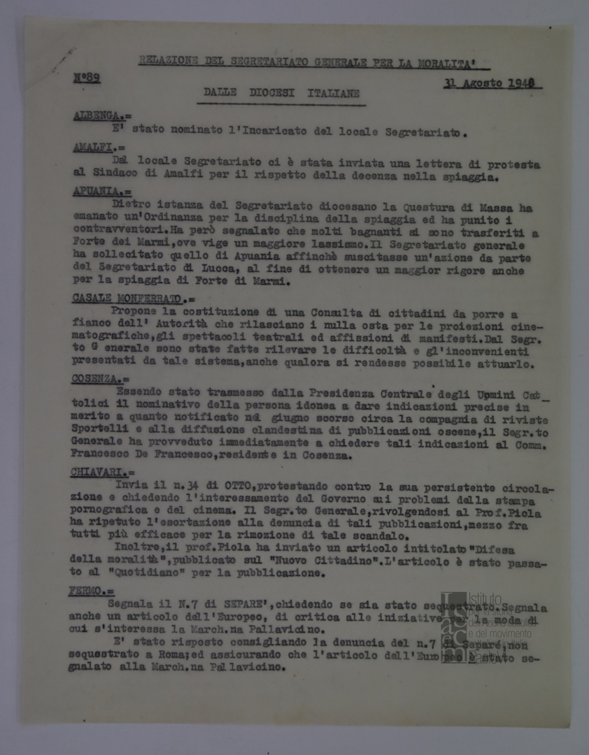 "Relazione del Segretariato Generale per la Moralità. Nr. 89"