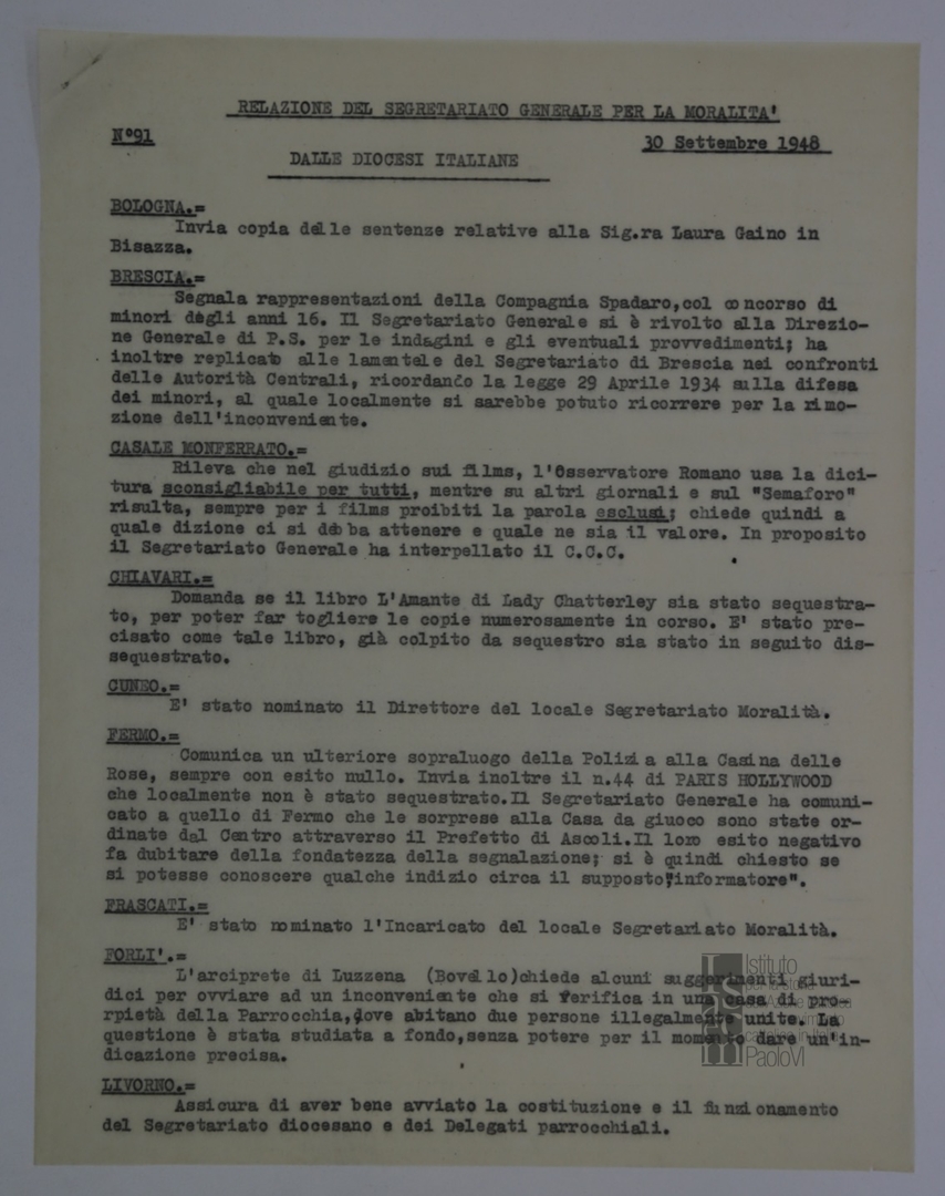 "Relazione del Segretariato Generale per la Moralità. Nr. 91"