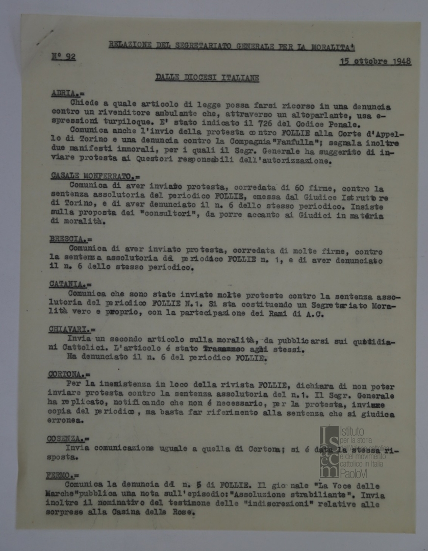 "Relazione del Segretariato Generale per la Moralità. Nr. 92"