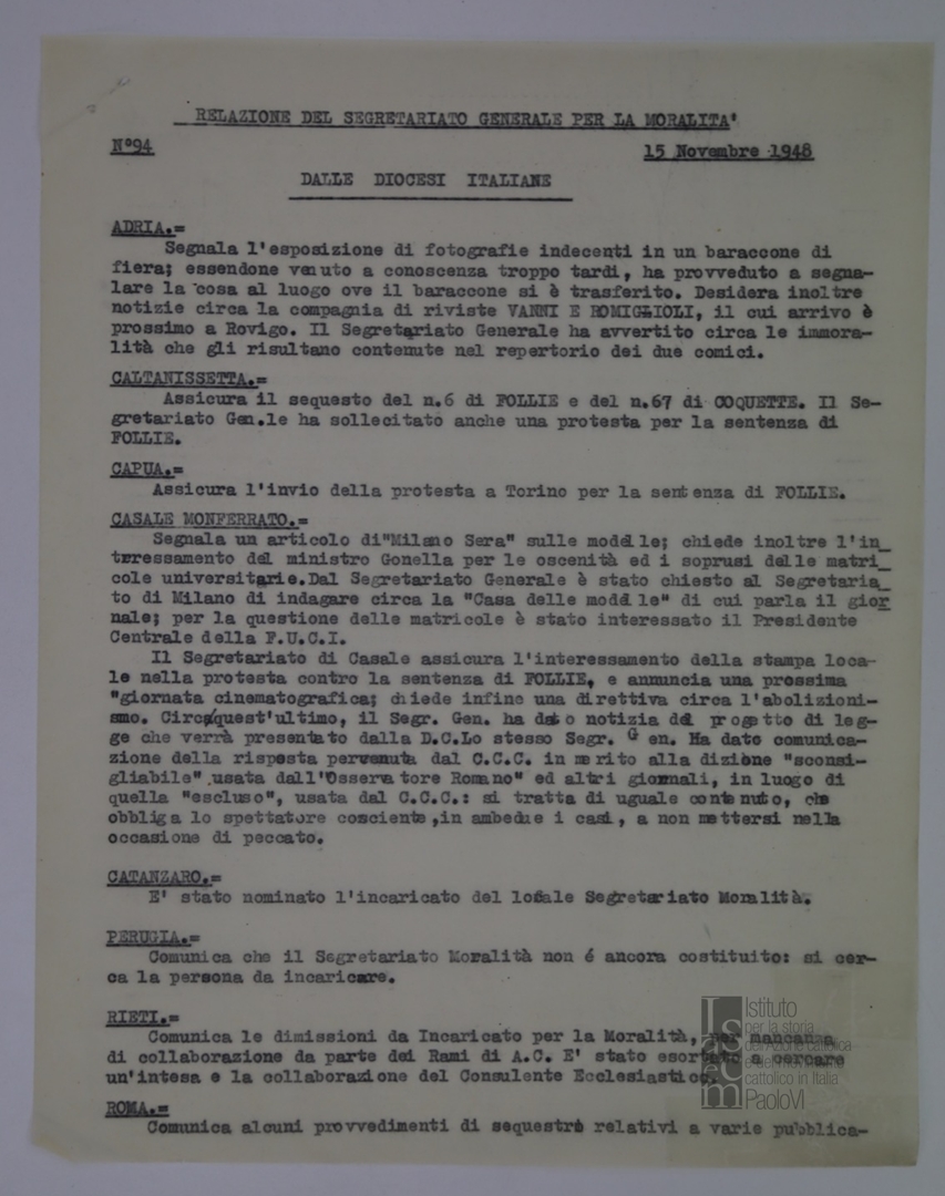 "Relazione del Segretariato Generale per la Moralità. Nr. 94"
