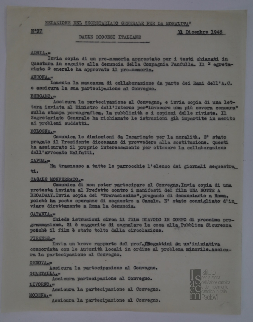 "Relazione del Segretariato Generale per la Moralità. Nr. 97"
