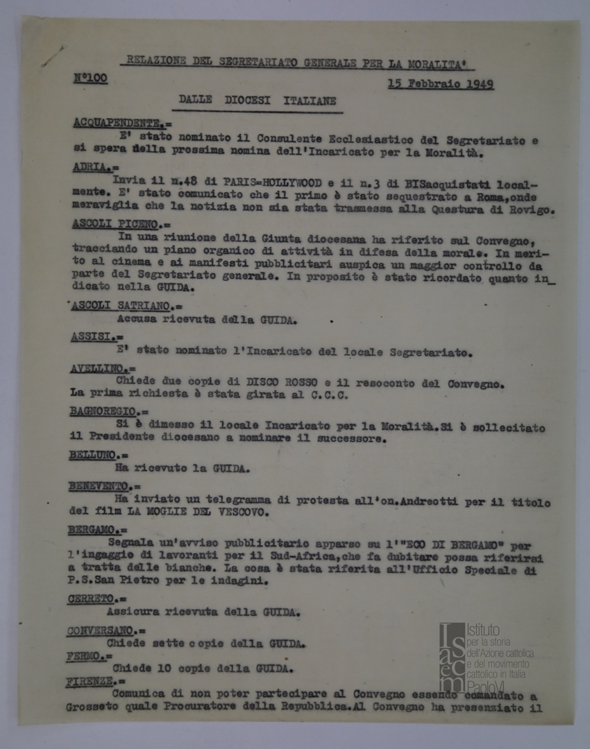 "Relazione del Segretariato Generale per la Moralità. Nr. 100"