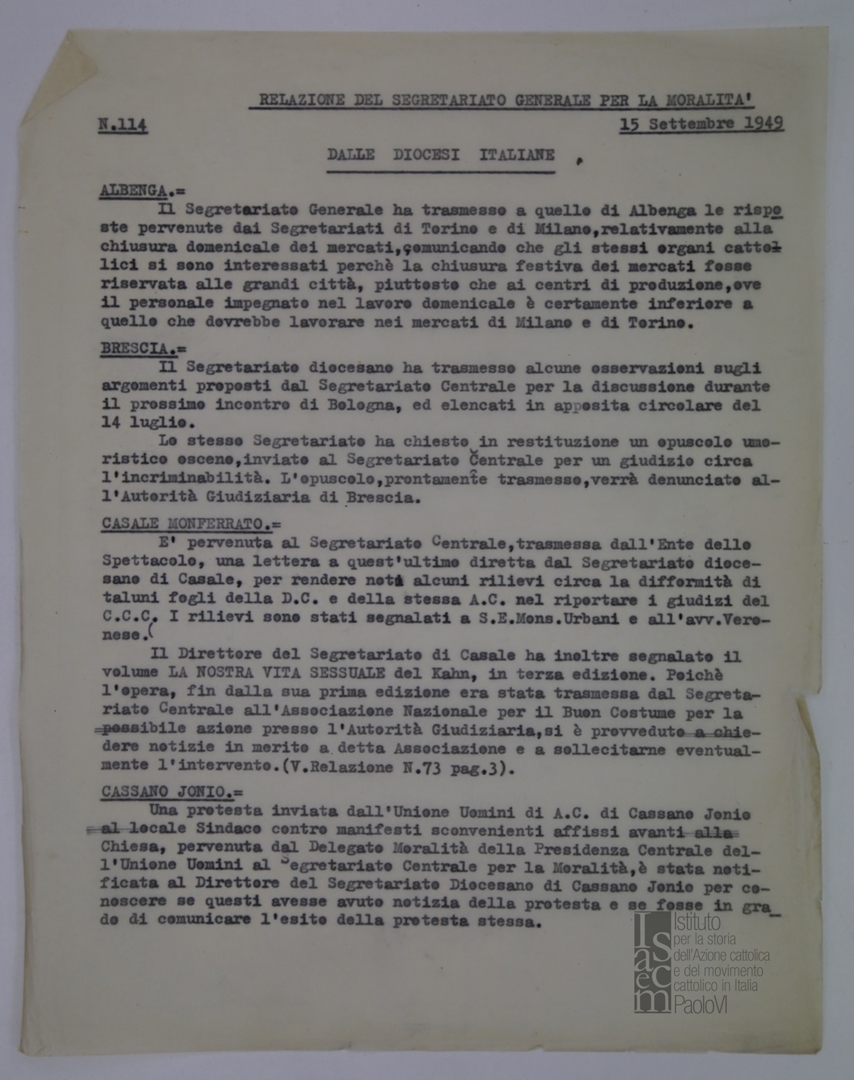 "Relazione del Segretariato Generale per la Moralità. Nr. 114"