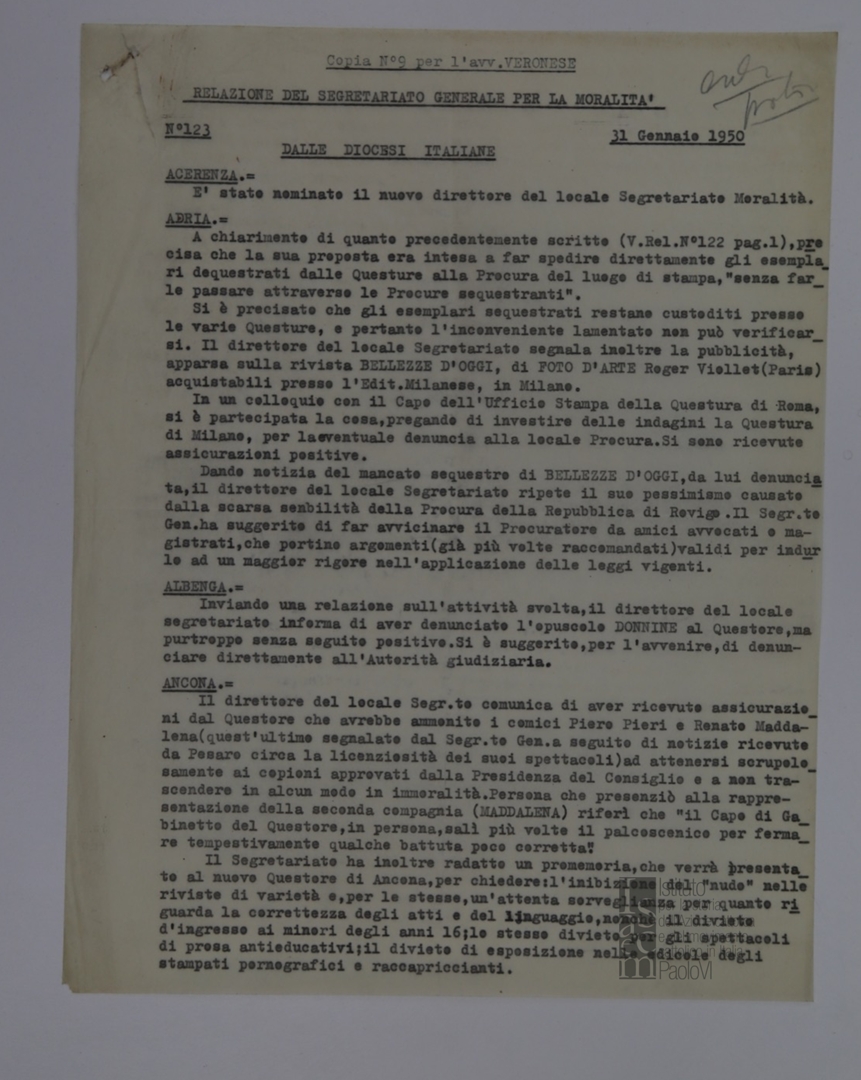"Relazione del Segretariato Generale per la Moralità. Nr. 123"