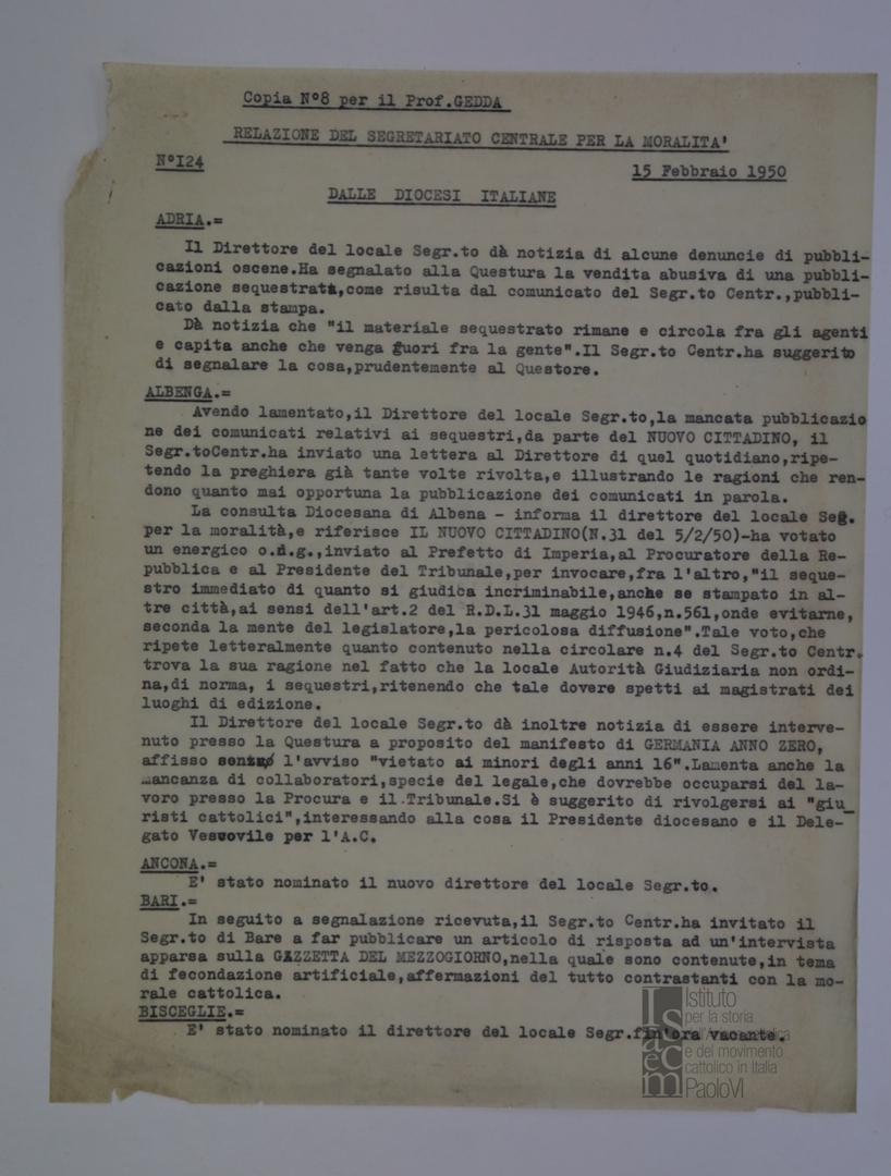 "Relazione del Segretariato Generale per la Moralità. Nr. 124"