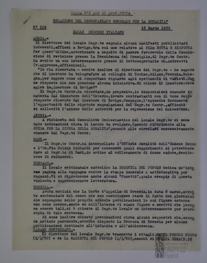 "Relazione del Segretariato Generale per la Moralità. Nr. 126"