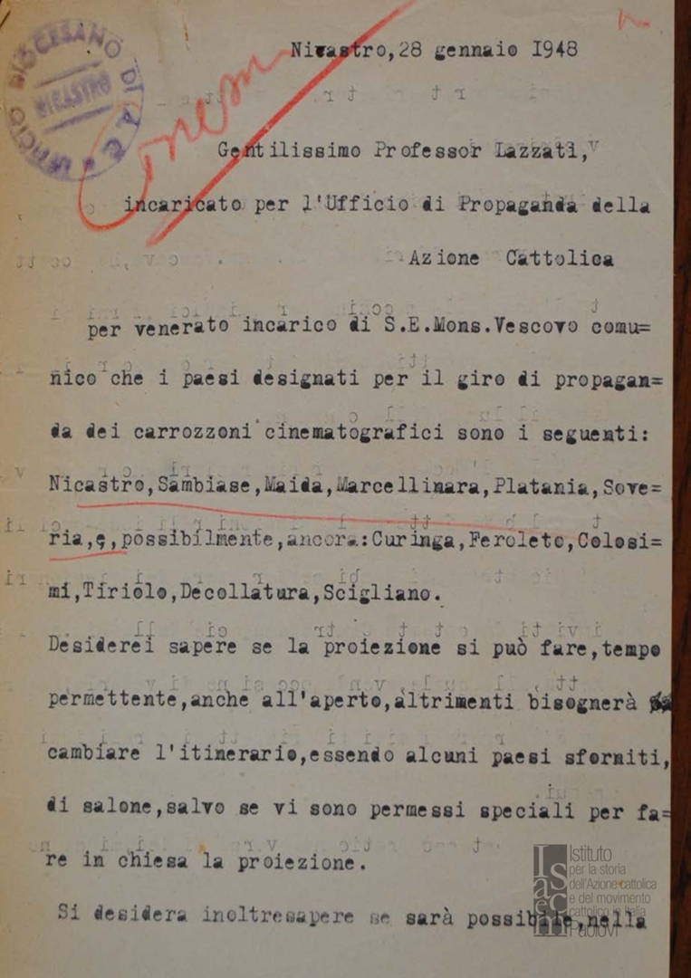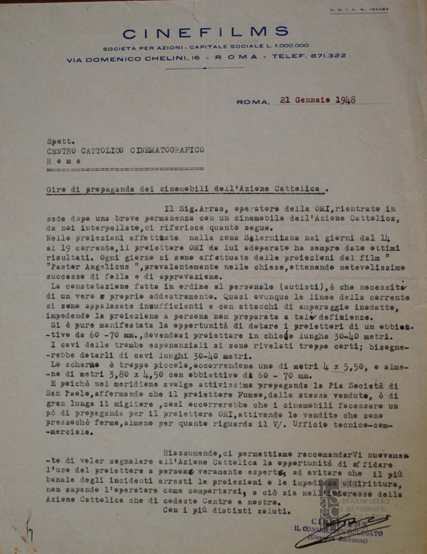 Lettera di Luigi Palma, segretario generale del Centro nazionale di Azione Cattolica di Roma, alla società Cineindustria di Roma