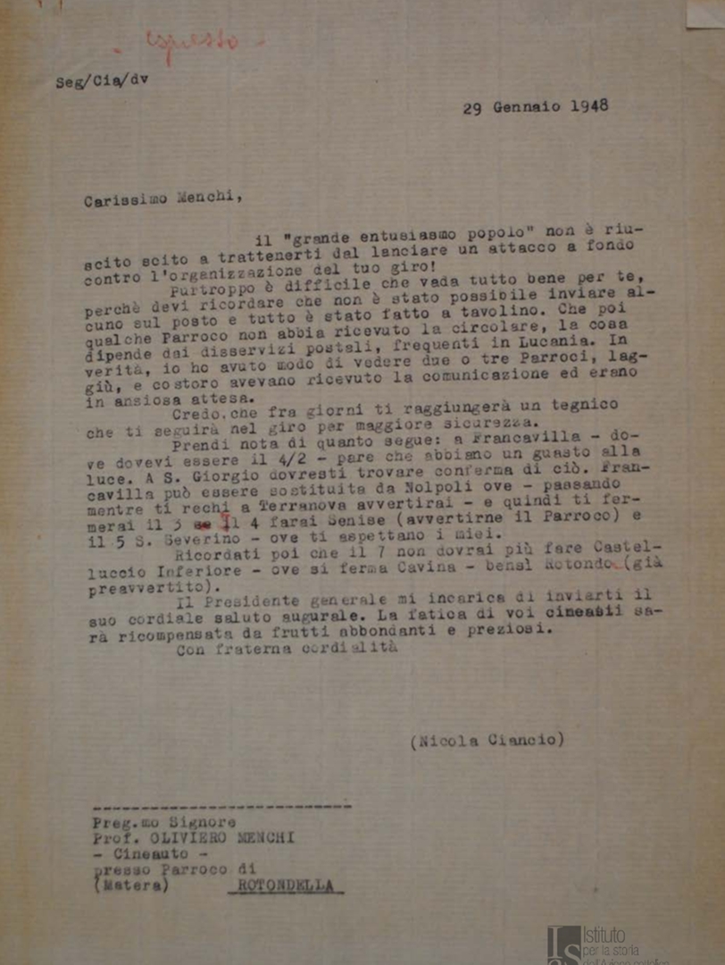 Lettera dell'avv. Nicola Ciancio, capo della segreteria della presidenza generale dell'ACI, a Oliviero Menchi, responsabile delle cine auto nella provincia di Matera