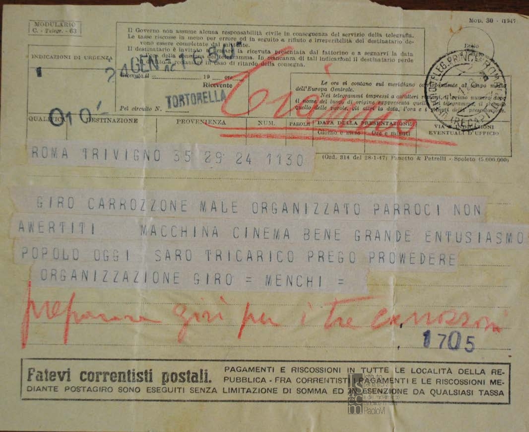 Telegramma di Oliviero Menchi, responsabile delle cine auto nella provincia di Matera, all'avv. Nicola Ciancio, capo della segreteria della presidenza generale dell'ACI