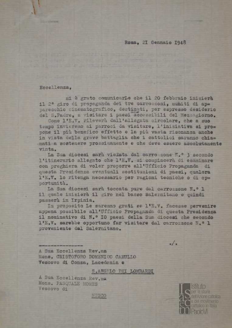 Lettera di mons. Giovanni Urbani, vescovo di Assume e assistente generale dell'Azione cattolica italiana, a mons. Cristoforo Domenico Carullo, vescovo di Conza, Lacedonia e Sant'Angelo dei Lombardi in provincia di Avellino, e a mons. Pasquale Mores, vescovo di Nusco in provincia di Avellino