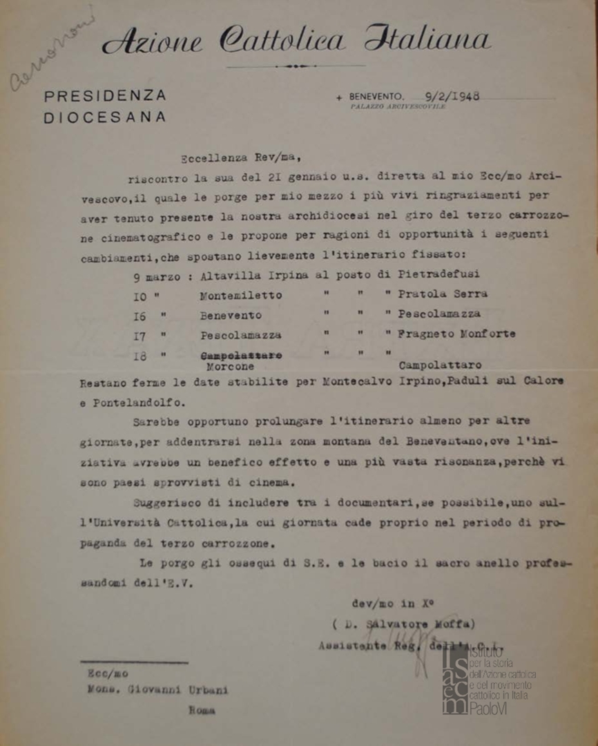 Lettera di Salvatore Moffa, assistente regionale dell'ACI, a mons. Giovanni Urbani, vescovo di Assume e assistente generale dell'ACI