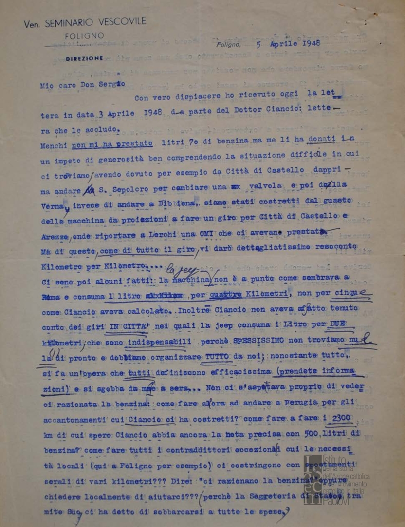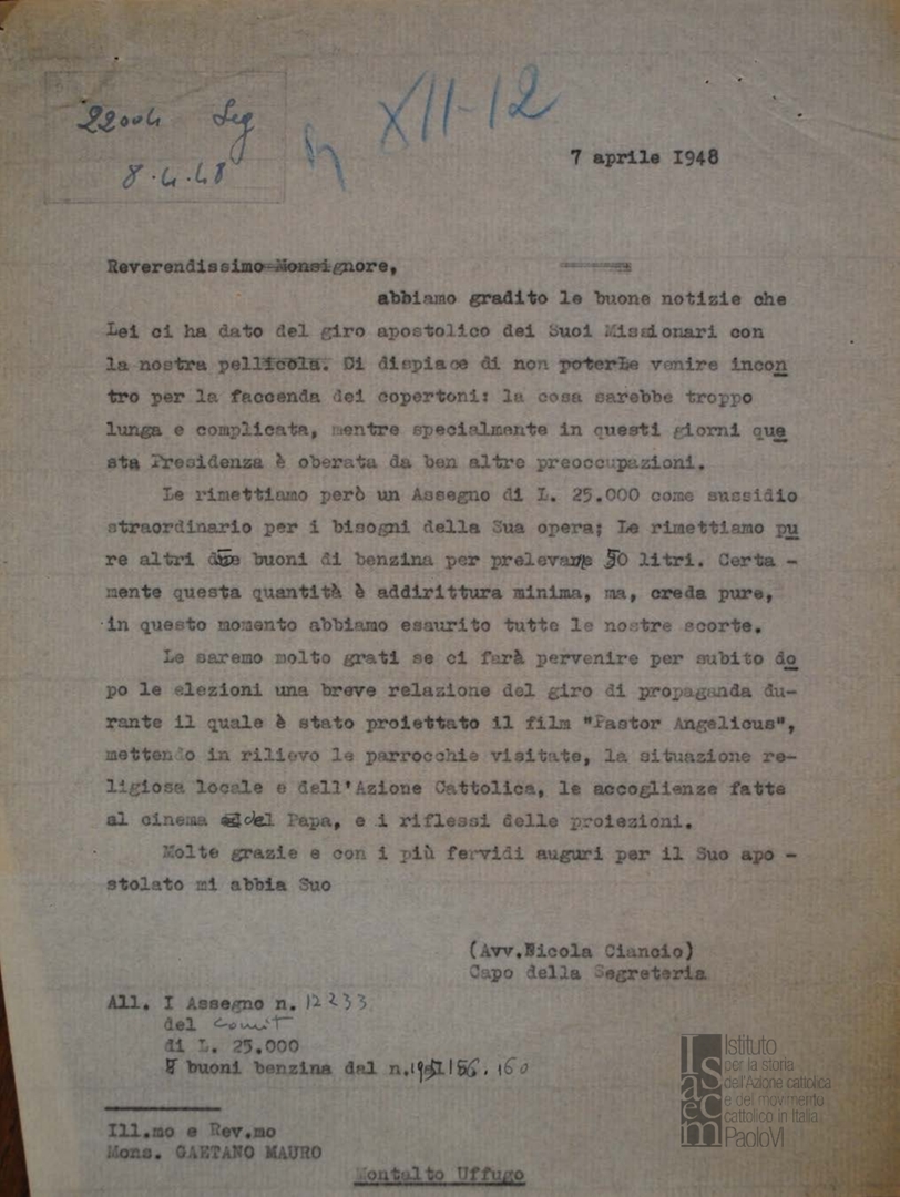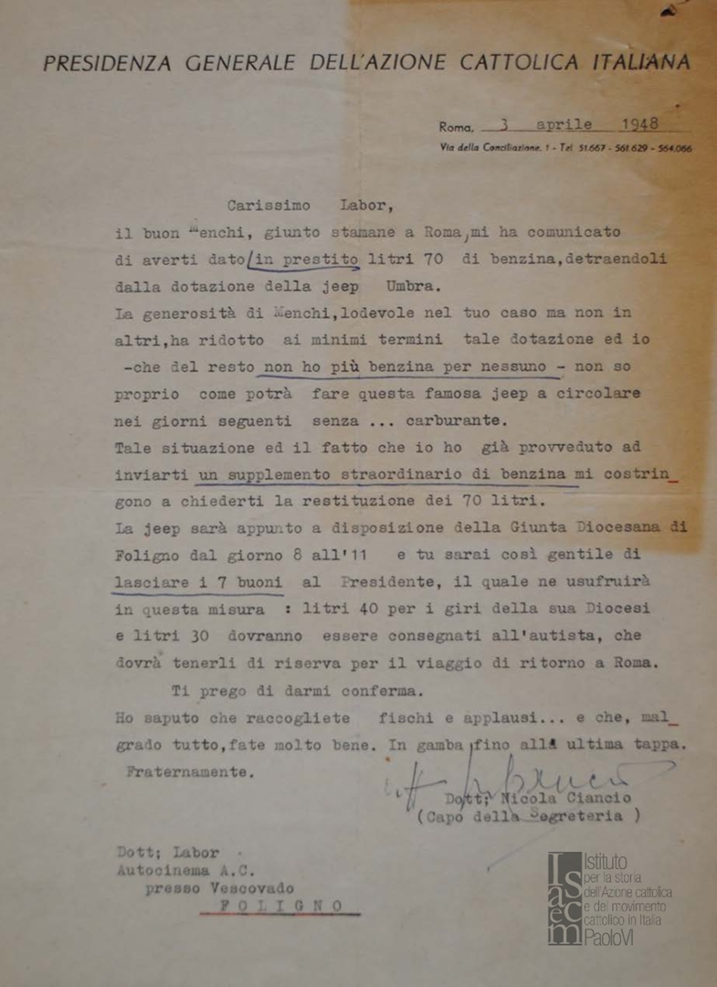 Lettera dell'avv. Nicola Ciancio, capo segreteria della presidenza generale dell'ACI, a don Livio Labor del seminario arcivescovile di Foligno