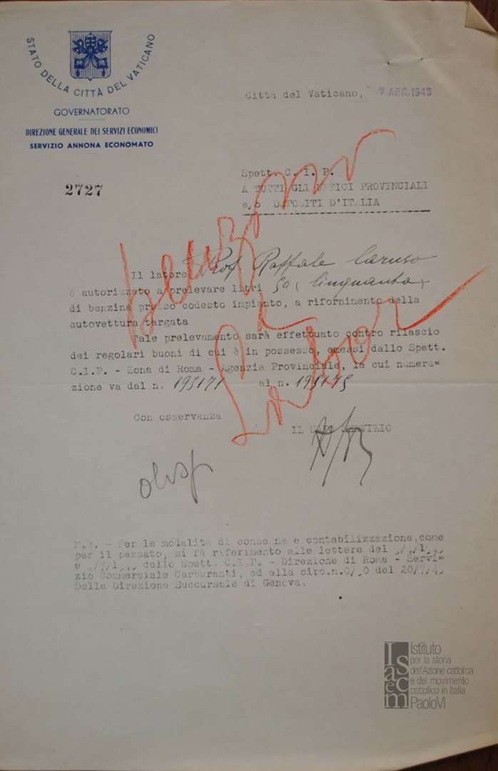 Lettera della Direzione dei servizi economici della Città del Vaticano agli uffici provinciali e/o depositi d'Italia