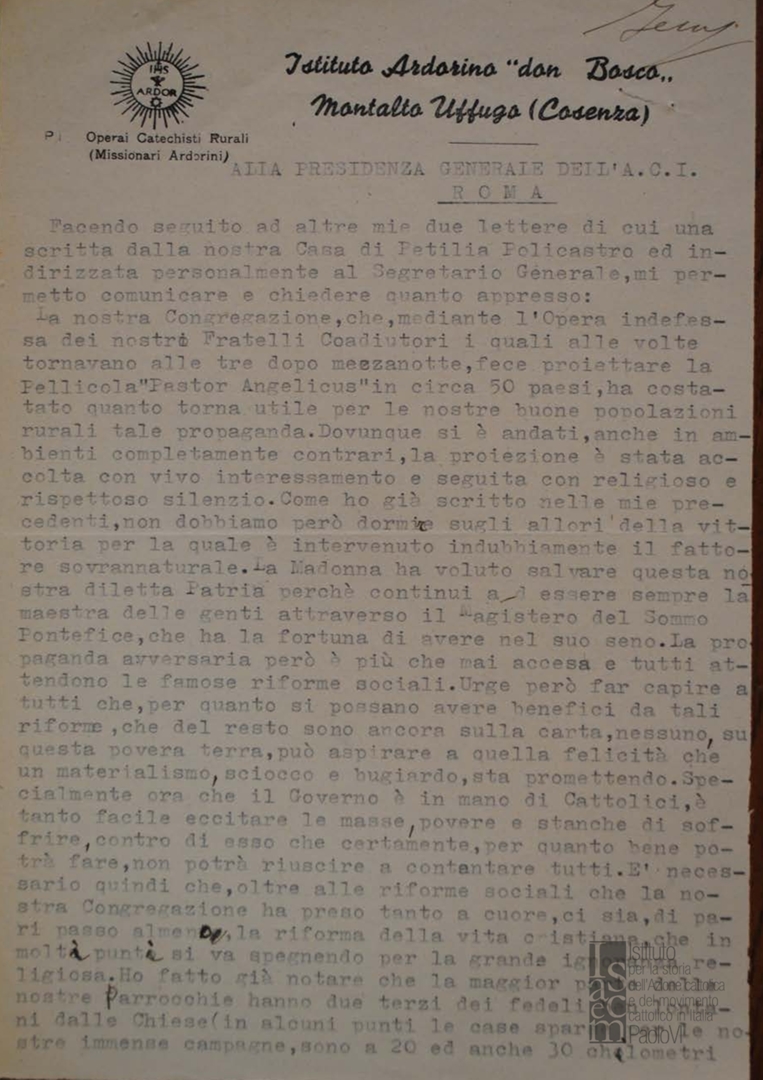 Lettera di mons. Gaetano Mauro, della Congregazione dei Pii Operai Catechisti Rurali (Missionari Ardorini), alla Presidenza generale dell'ACI
