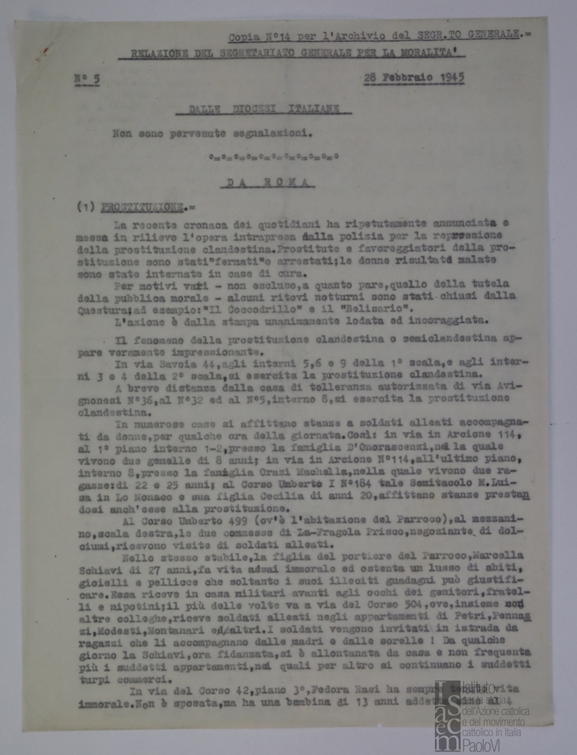 "Relazione del Segretariato Generale per la Moralità. Nr. 5"